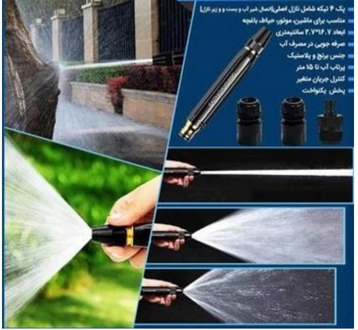 سایر توضیحات: قابلیت تنظیم میزان پاشش آب (با چرخاندن سر کارواش)، امکان استفاده به عنوان نازل سمپاشی، و شستشوی سطوح مختلف.