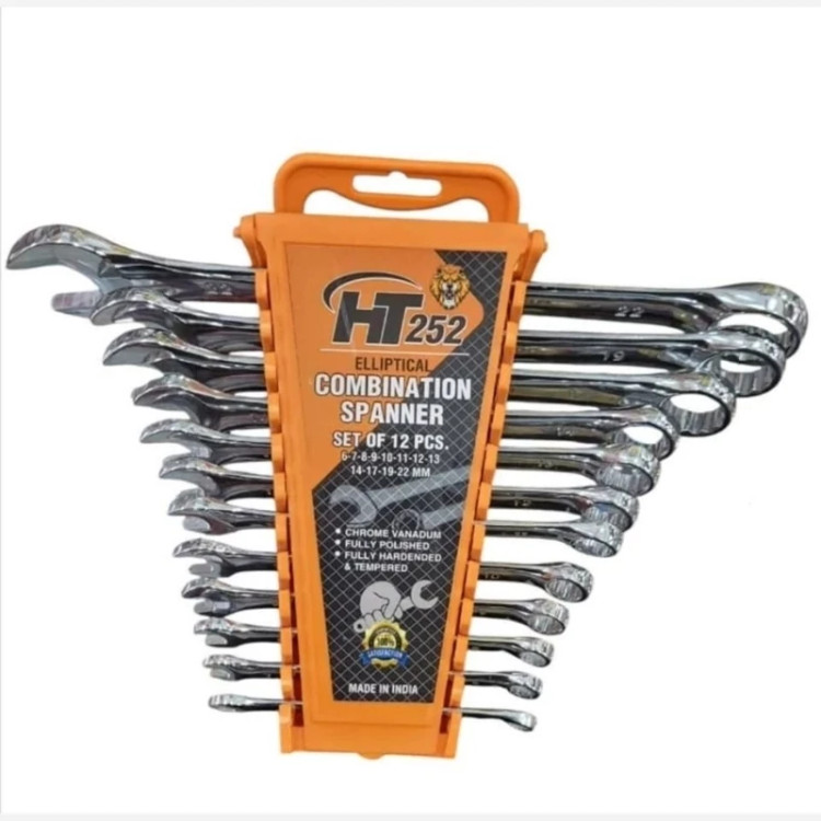 آچار پلکانی 12 عددی HT، یک ست کامل از آچار یک سر تخت و یک سر رینگی است که شامل سایزهای 6-7-8-9-10-11-12-13-14-17-19 و 22 میلیمتر میباشد. این آچارها از جنس کروم وانادیوم ساخته شده و دارای آبکاری براق و با کیفیت هستند. وزن این ست حدود 1.010 کیلوگرم است و ساخت کشور هند میباشد.
