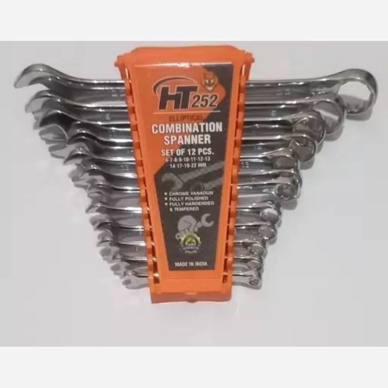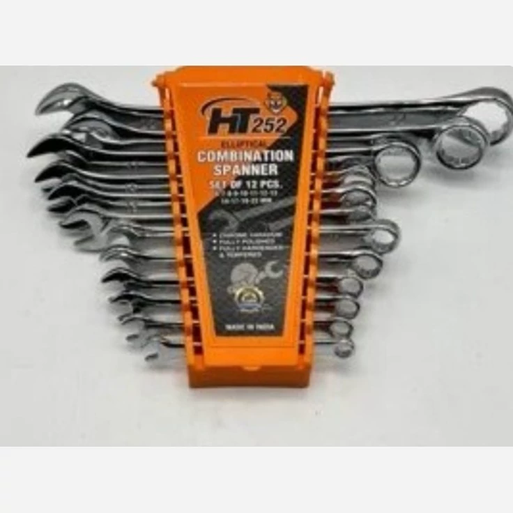 آچار پلکانی 12 عددی HT، یک ست کامل از آچار یک سر تخت و یک سر رینگی است که شامل سایزهای 6-7-8-9-10-11-12-13-14-17-19 و 22 میلیمتر میباشد. این آچارها از جنس کروم وانادیوم ساخته شده و دارای آبکاری براق و با کیفیت هستند. وزن این ست حدود 1.010 کیلوگرم است و ساخت کشور هند میباشد.